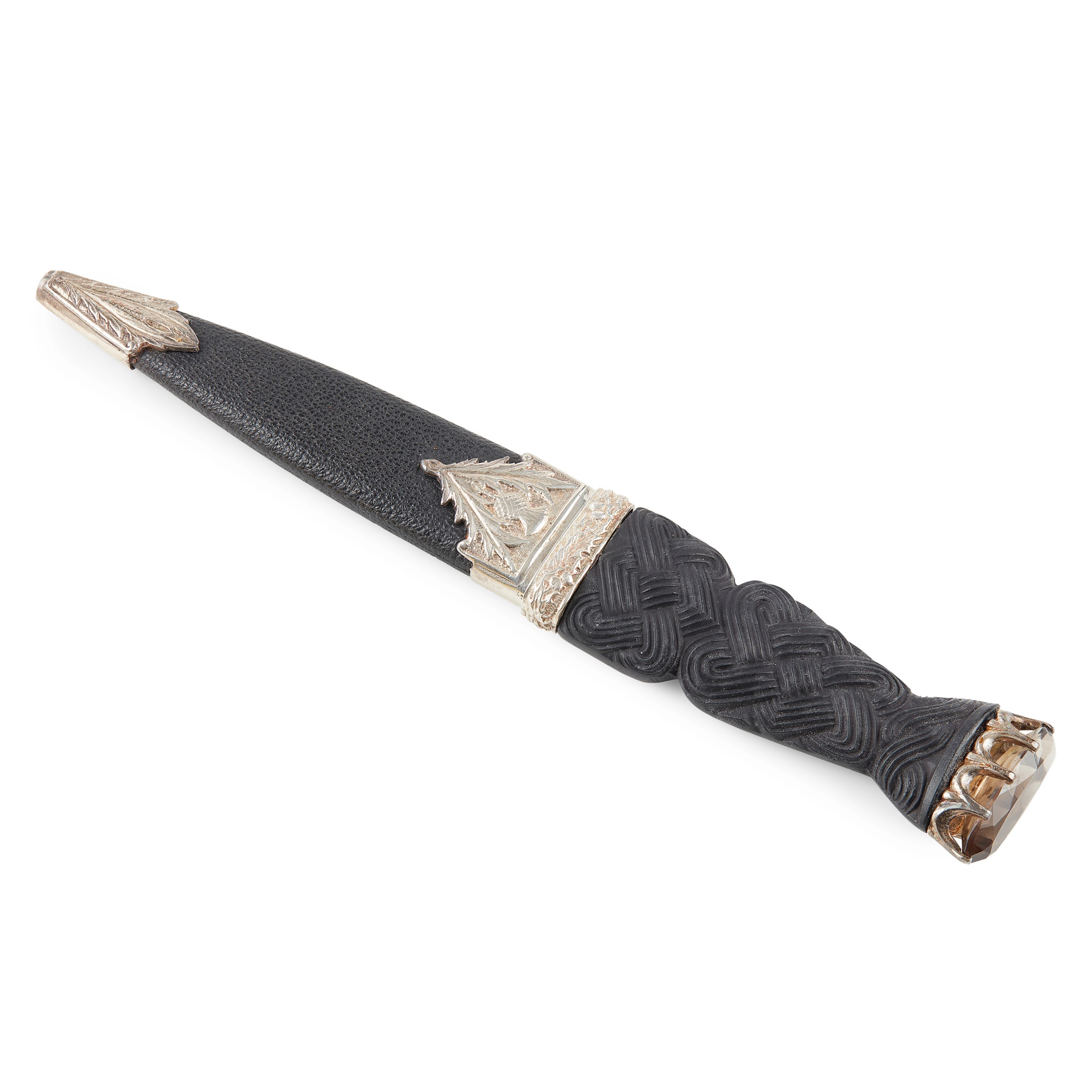 basket weave handle claw set with smokey quartz scabbard with cast thistle mounts