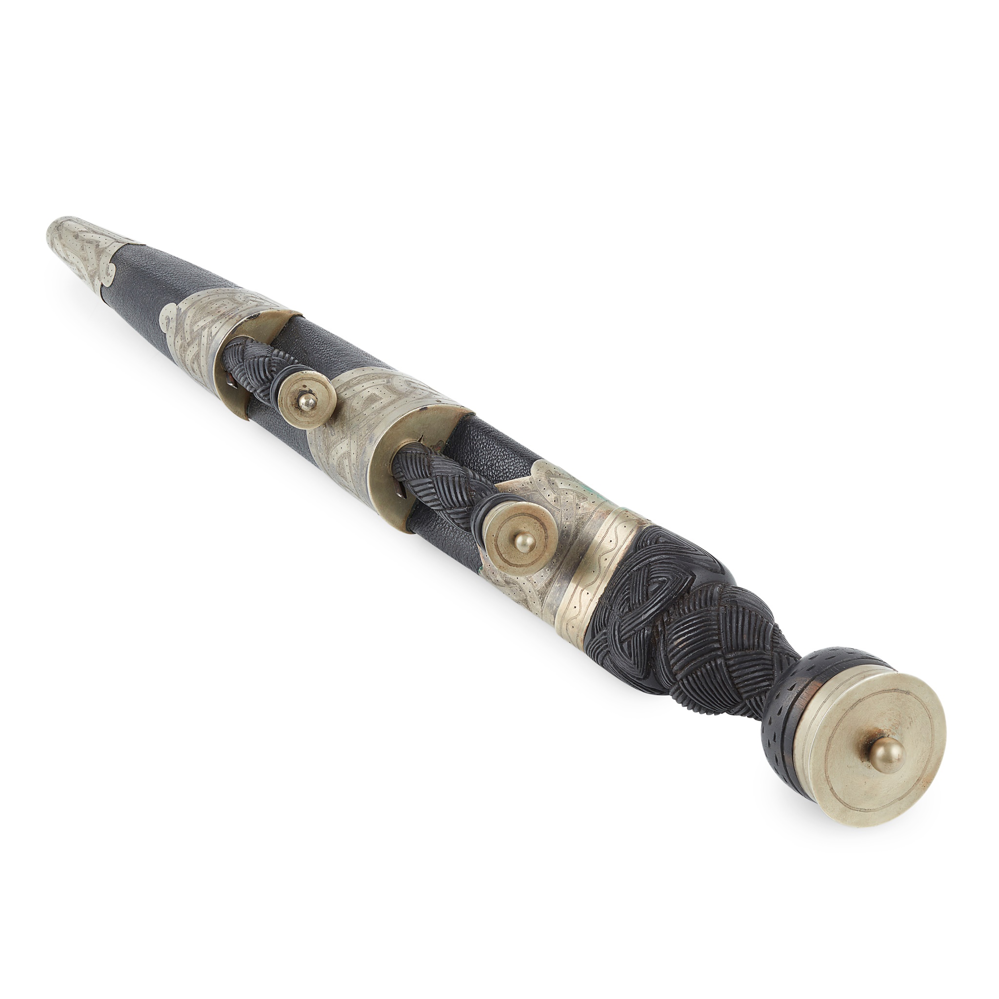 of conventional form, black leather covered scabbard with plated mounts, bi-knife and fork, single-edged saw back blade with single fuller