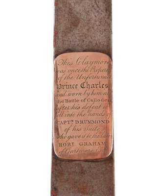 Note: The applied 19th century gold plaque reads ‘The claymore was once the property of the Unfortunate Prince Charles and worn by him at the Battle of Culloden, after his defeat it fell into the hands of CAPt DRUMMOND of his suite who gave it to the late ROBt GRAHAM of Gartmore Esq’.
