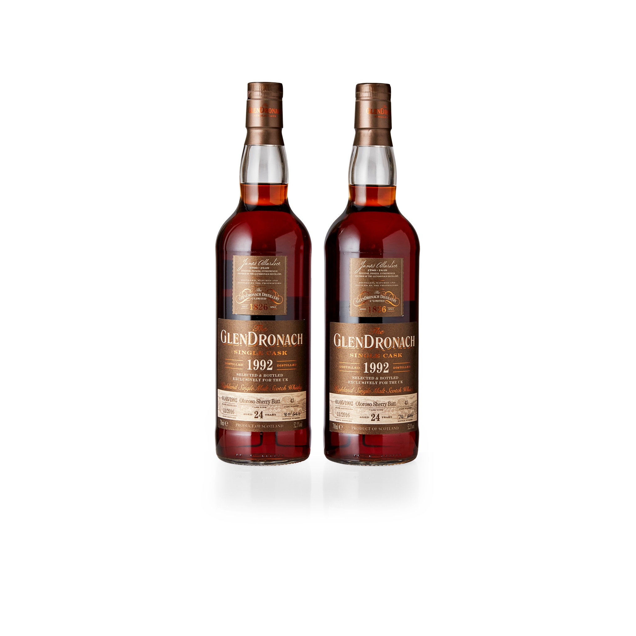 cask number 43, bottles 74 and 80 of 644, each with carton