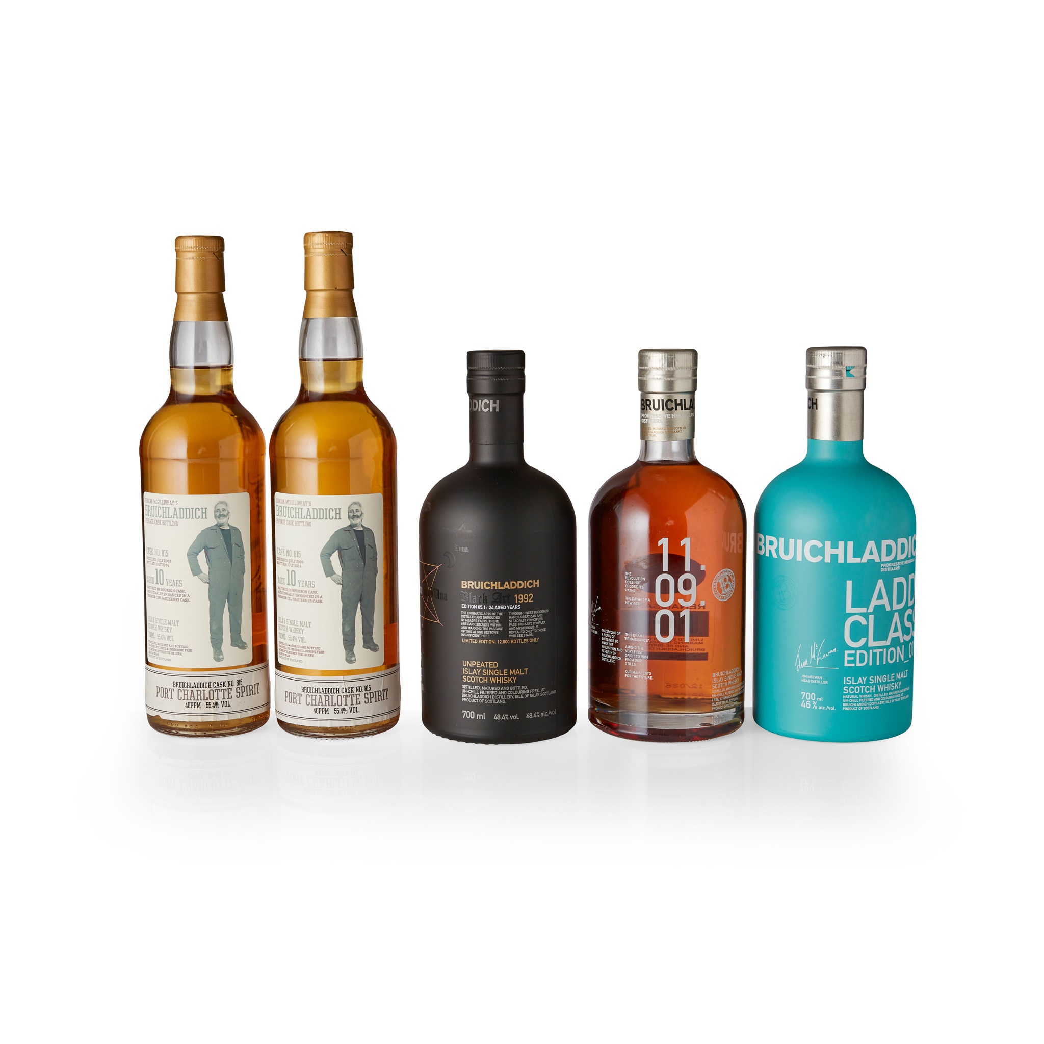 with tin, 700ml/ 48.4%; together with a BRUICHLADDICH CLASSIC LADDIE, with tin, 700ml/ 46%; a BRUICHLADDICH RENAISSANCE 2001 9 YEAR OLD, with tin, 700ml/ 46%; and TWO BOTTLES OF BRUICHLADDICH PRIVATE CASK 10 YEAR OLD, cask number 815, 700ml/ 55.4%