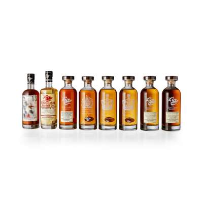 filled 2007, bottled 2012, cask 859, bottle number 46 of 95, with presentation case; TWO BOTTLES OF THE ENGLISH WHISKY COMPANY 1953-2013 ANNIVERSARY BOTTLE, bottled to commemorate the 60th Anniversary of the Coronation of Queen Elizabeth II, each with cartons, 70cl/ 40%; a 1952-2012 COMMEMORATIVE BOTTLE, to commemorate the Diamond Jubilee of Queen Elizabeth II, with carton, 70cl/ 46%; a bottle of THE ENGLISH WHISKY COMPANY CHAPTER 14, cask type ASB, distilled 2011, bottled 2016, with carton, 70cl/ 46%; a bottle of THE ENGLISH WHISKY COMPANY CHAPTER 13, with carton, 70cl/ 45%; and an ENGLISH WHISKY COMPANY FOUNDERS PRIVATE CELLAR PRESENTATION GIFT SET, containing a bottle of FOUNDERS PRIVATE CELLAR RUM CASK, filled 2006, bottled 2014, bottle number 17 of 238, 70cl/ 55.1%; and a bottle of FOUNDERS PRIVATE CELLAR PEATED SHERRY CASK, filled 2007, bottled 2014, cask 842, bottle number 17 of 238, 70cl/ 55.7%