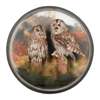 a pair of high quality full mount adults, both perched atop cut tree stumps above grasses and painted groundwork, set against a printed woodland scene backdrop, enclosed within a wall dome.