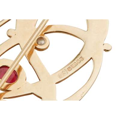 to include two 9ct gold gem-set scroll brooches from the 'Glasgow Girls' collection, each with a pearl dependent and another brooch modelled as a stylised tree, claw set with a citrine to the centre; together with another Celtic scroll brooch, by Ola Gorie