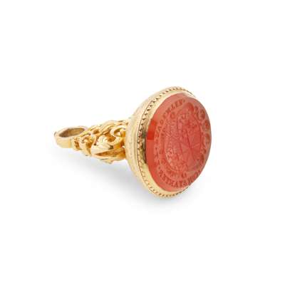 the oval carnelian matrix with arms of Hume-Campbell, for Alexander Hume Campbell, 2nd Earl of Marchmont and Lord Polwarth (1675-1740), the domed mount with foliate engraved detail, to a scroll surmount with shell detail and a suspension loop