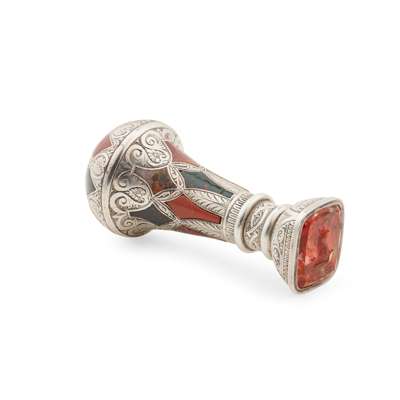 the domed handle and tapering stem set throughout with various panels of hardstones, with engraved scroll and foliate decoration, the orange paste matrix engraved with a crest in coronet