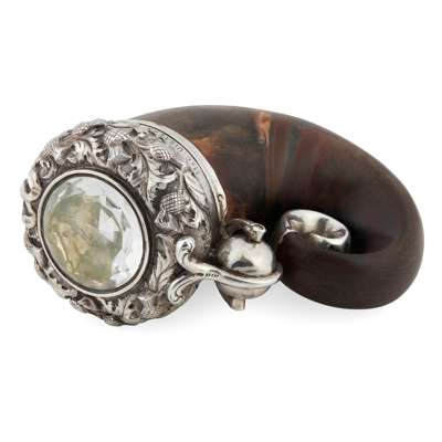 the polished tapered curly cow horn body with applied silver terminal and applied silver shield with crest, the hinged lid with ball socket, chased thistle decoration and a border with engraved presentation inscription, collet set with a yellow paste to the centre