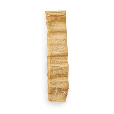 the horn of simple curled form, with collar mount to rim engraved with the inscription 'Presented from the Society to J. Marshall 1829', the hinged domed lid with scallop border, the circular disc engraved with 'GILCOMSTON FARMER'S SOCIETY 1759' set with a foil backed yellow paste; with associated newspaper clipping regarding the society
