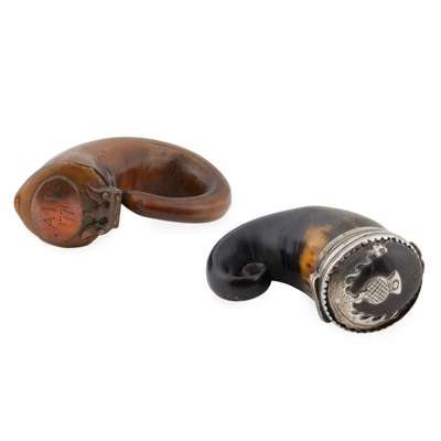 the polished cow horn modelled as a serpent, the hinged lid set with a copper plaque engraved AH1171; together with another, engraved to the collar, 'Niven MacVicar Sept 1821' with applied thistle detail to the hinged lid