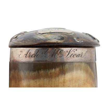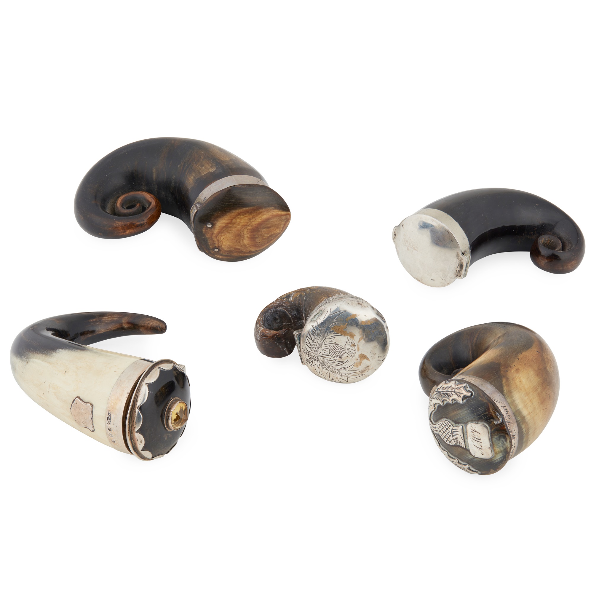to include, William Dunningham & Co., Edinburgh 1910, the hinged lid with a scallop border, claw set to the centre with a yellow paste; together with four curly horn snuff mulls, two with thistle decoration to the hinged lids