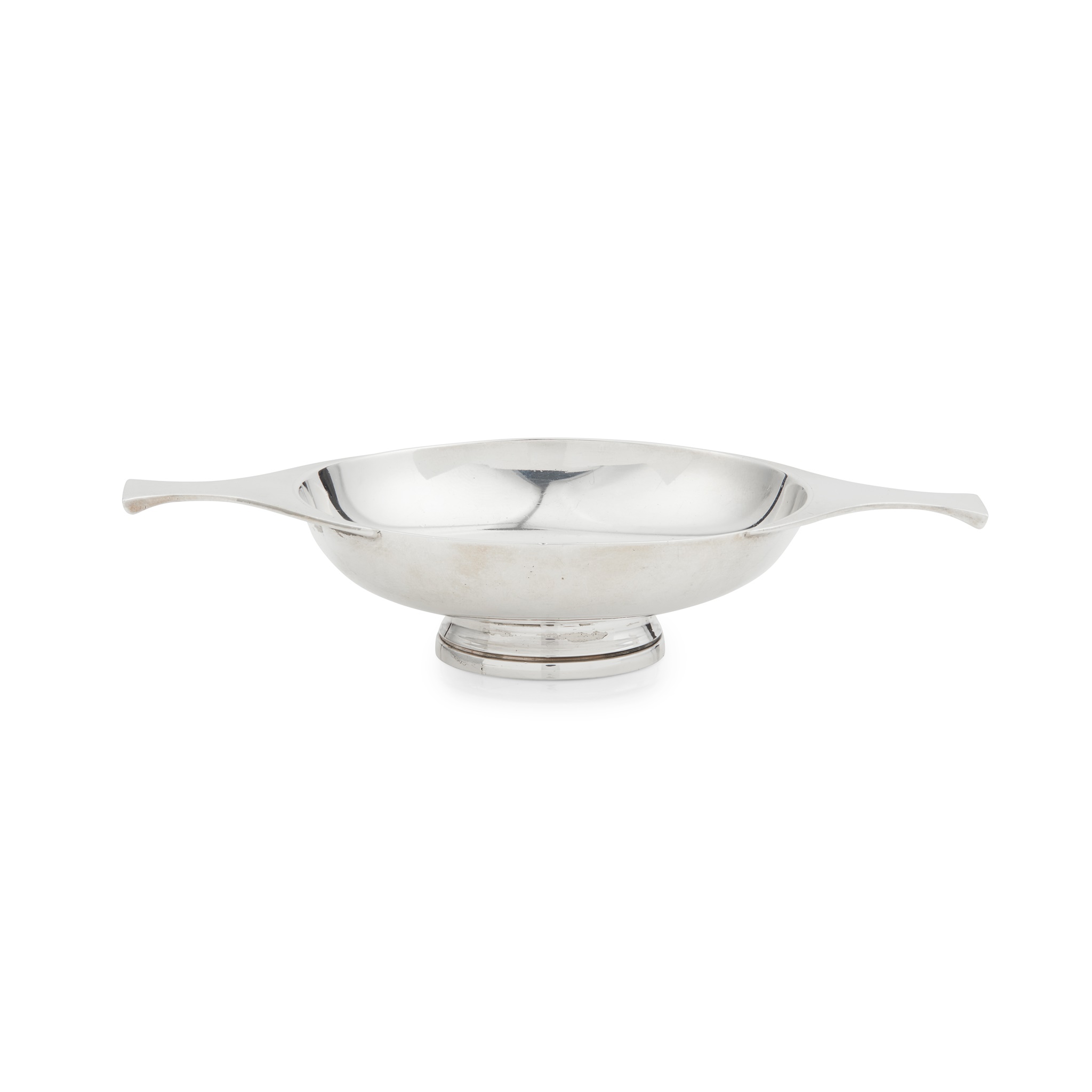 marked ROBB / BALLATER, Edinburgh 1908, the shallow bowl with twin inswept handles and raised on a collet foot