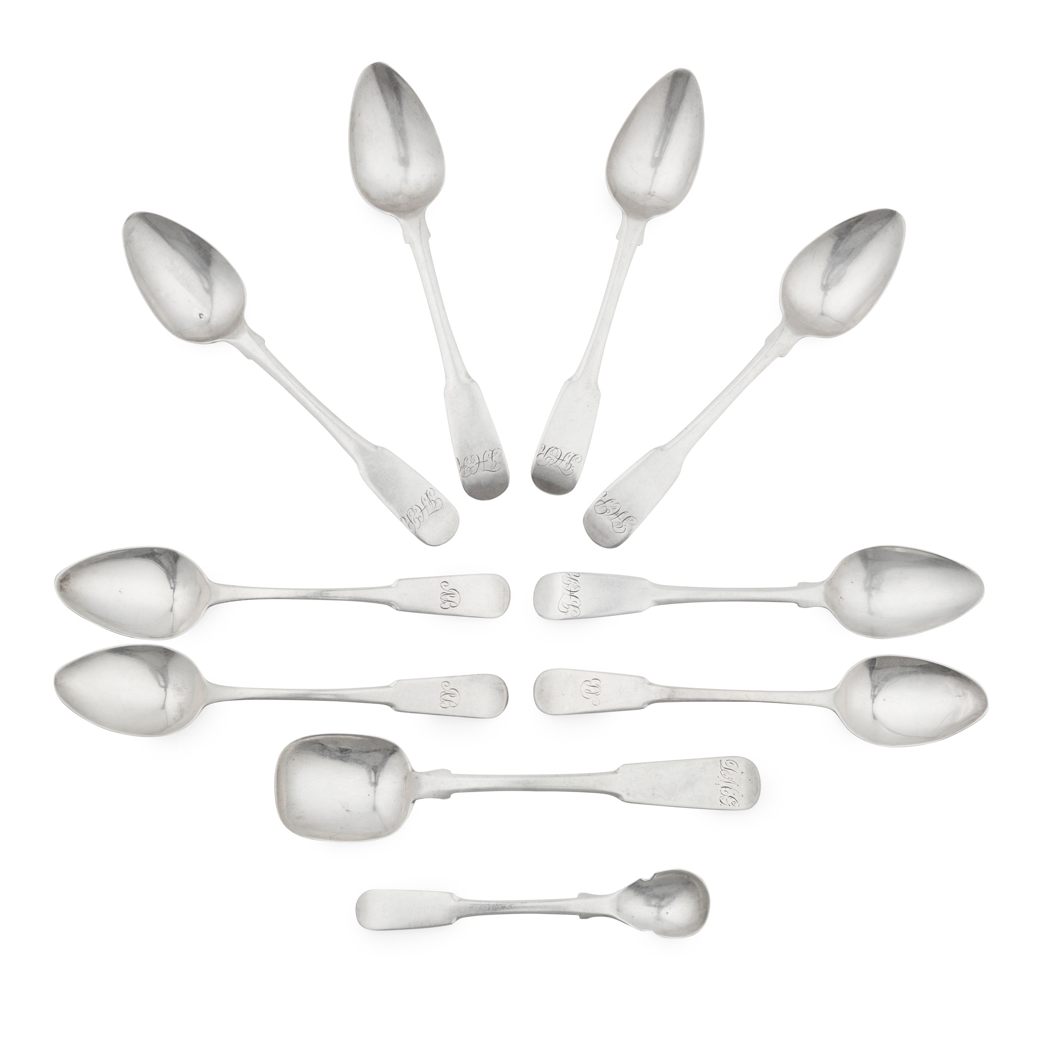 various marks, all of Fiddle pattern with engraved initials to terminal; together with a jam spoon and an egg spoon