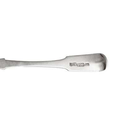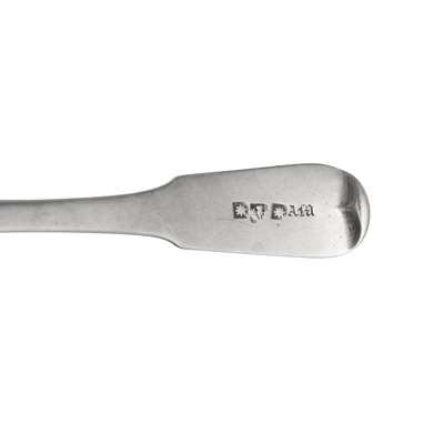 to include various makers and marks, a Fiddle pattern teaspoon, by Joseph Pearson of Dumfries and another, Adam Burgess; another, possibly of Cupar, marked GC***; a fish slice and toddy ladle, by Cameron of Dundee; a toddy ladle, William Ferguson of Elgin, a teaspoon by J. Pozzie and R. Stewart and two salt spoons by Charles Fowler; a Greenock dessert spoon, a collection of Paisley flatware including William Hannay and of Perth, including Robert Keay and a collection of unattributed