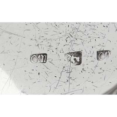 marked CM, stag's head, CM, the bowl of oval outline, the everted rim with spout to one side, engraved initials to underside JD/EA, the wooden handle of baluster form with ball terminal