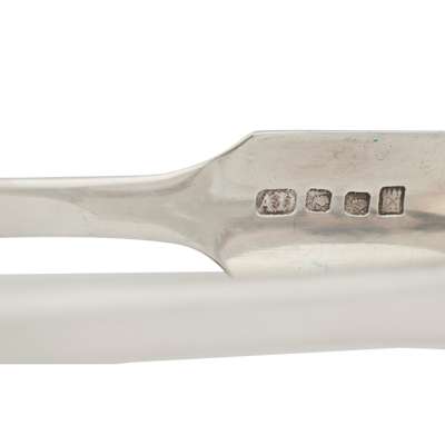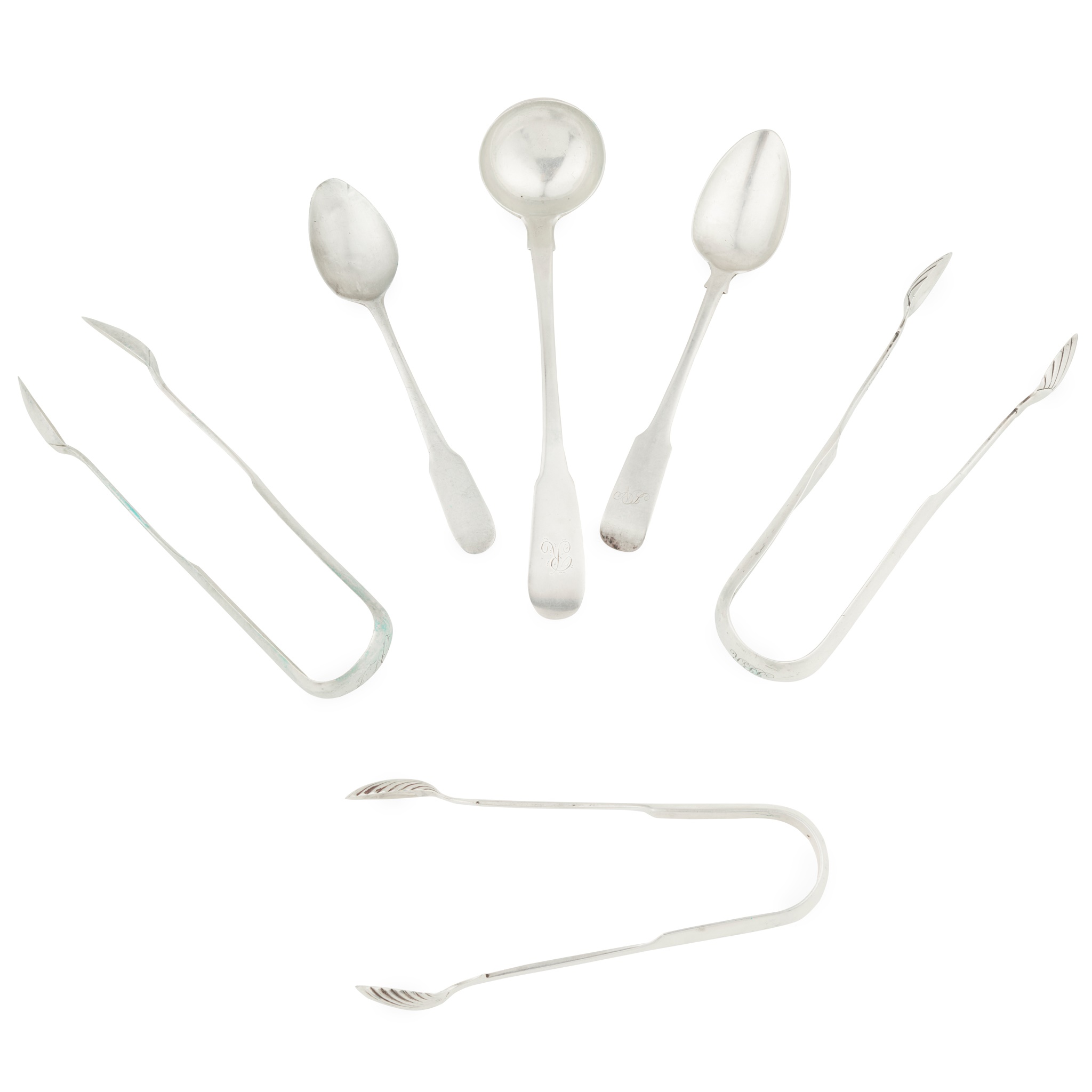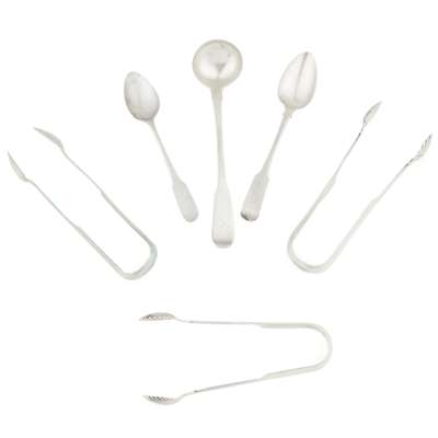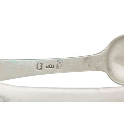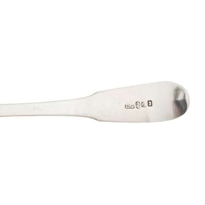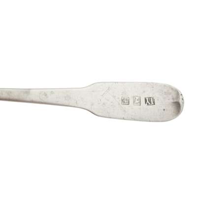 James Johnstone, marked stag's head, K, anchor, JI, of Fiddle pattern with initial to the terminal; together with a small group of Dumfries flatware including sugar tongs, toddy ladles and a teaspoon various makers