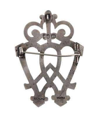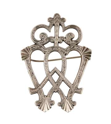 marked J, T, M (all in gothic script), MACKAY, ELGIN, of large conjoined open heart form with Inverness style open spectacle crown surmounting, the whole with foliate engraved decoration