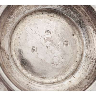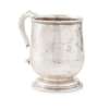 of slight baluster form, engraved initials to body 'M/ I C/ IC' with an S-scroll handle, to a stepped circular foot