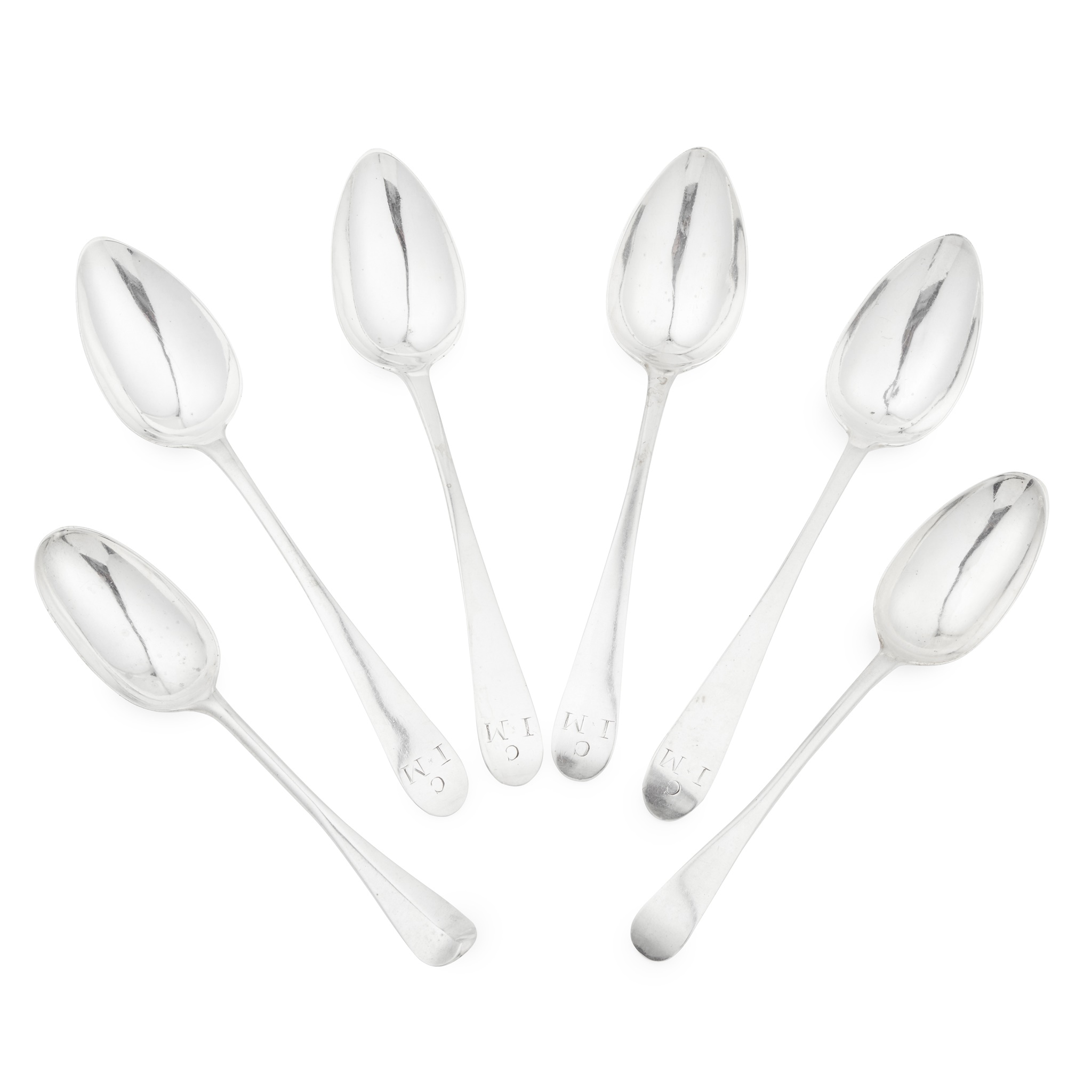 marked AC, ship, anchor, ship, one marked, AC, anchor, tree, anchor, all of Old English pattern, engraved initials to a terminal; together with another Adam Graham of Glasgow, marked AG, town mark, twice, of Old English pattern and a tablespoon, Ker & Dempster, Edinburgh 1765, of Hanoverian pattern, foliate initials engraved to reverse of the terminal