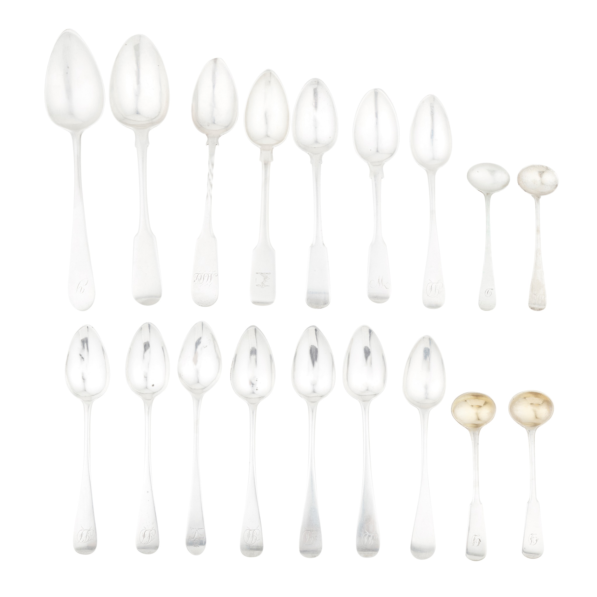 marked WM, INS of Fiddle pattern with twisted stem; a set of six teaspoons by C Jamieson and other items by R Naughton, A McRae, D Fraser
