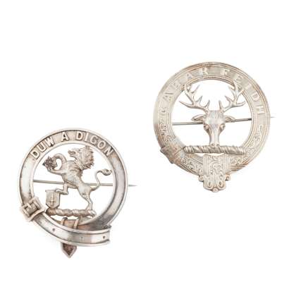 marked PGW, INS, set with a stag's head to the centre, the border with engraved 'CABAR FEIDH', engraved presentation inscription to the reverse; together with another, Alex and John Smith of Aberdeen, marked A&JS, ABDN, a cast Lion rampant to the centre holding rose and standing on a shield, 'DUW A DIGON' to the border