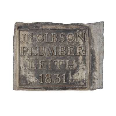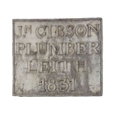 each a sand-cast lead sheet with relief inscription 'Jn. Gibson, Plumber, Leith, 1831'; one cropped to the edges, the other with borders of rough lead