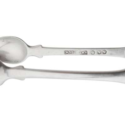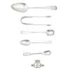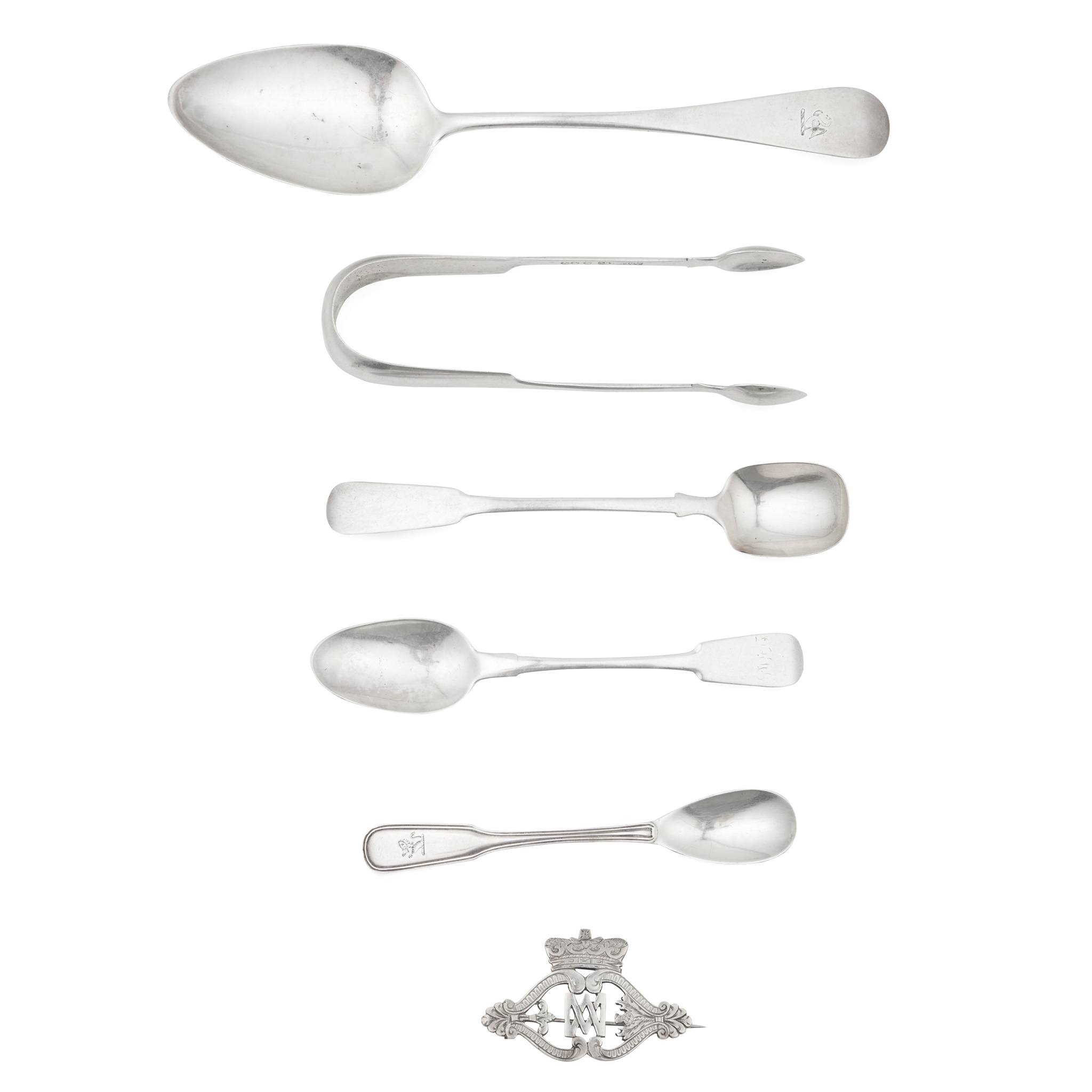marked PGW, INS, formed with a cypher to the centre, flanked to either side by a thistle and a fleur de lys, each with scroll shoulders, surmounted by a coronet; together with a tablespoon, Donald Fraser, marked DF, INS, of Old English pattern, engraved crest to the terminal, and a teaspoon, of Fiddle pattern; together with a pair of sugar tongs, by Alexander MacLeod and two various condiment spoons