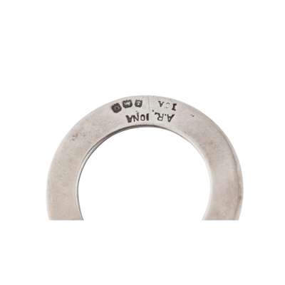marked A.R. IONA, ICA, Birmingham 1938, of simple annular form, turquoise enamel with a Gaelic motto, with an integral swing pin