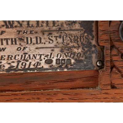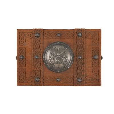 of rectangular outline, Celtic knotwork detail throughout with Celtic knot bosses, the hinged lid with the Montrose Coat of Arms, a silver presentation plaque to the front with engraved inscription '...Freedom of the Burgh conferred upon Mrs. Helen Wyllie, daughter of Rev. Alexander Keith D.D. St.Cyrus and widow of James Wyllie Merchant London 17th June 1914' with twin loop handles, raised on four stepped feet
