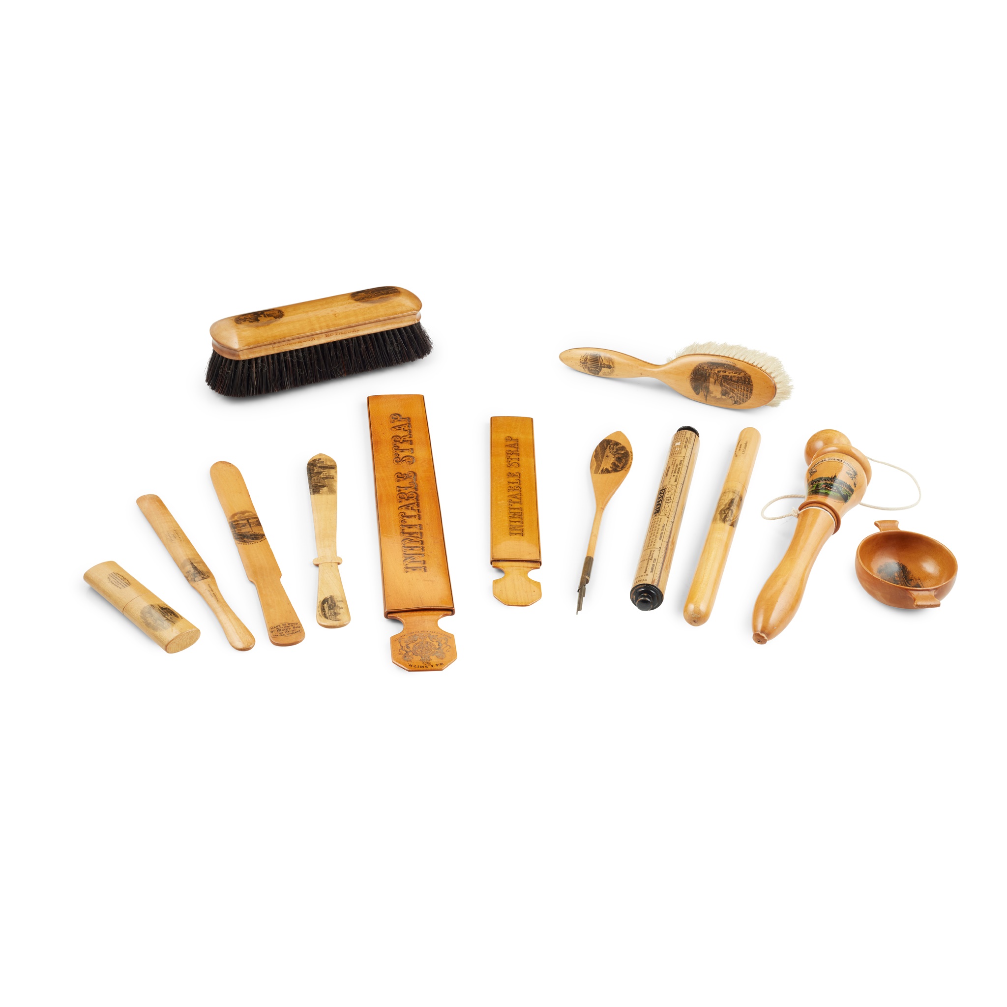 comprising two 'Inimitable straps' by W & A Smith, 35cm and 24cm long, a small quaich, a clothes brush, a hair brush, a ball and cup games, three letter openers, a postal rules etc