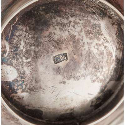 marked CM, double-headed eagle, CM, of traditional form, the lugs engraved with crest and motto to one and presentation inscription to the other, 'From Mrs. Colonel Stewart to Henry Glassford Bell', raised on a circular foot
