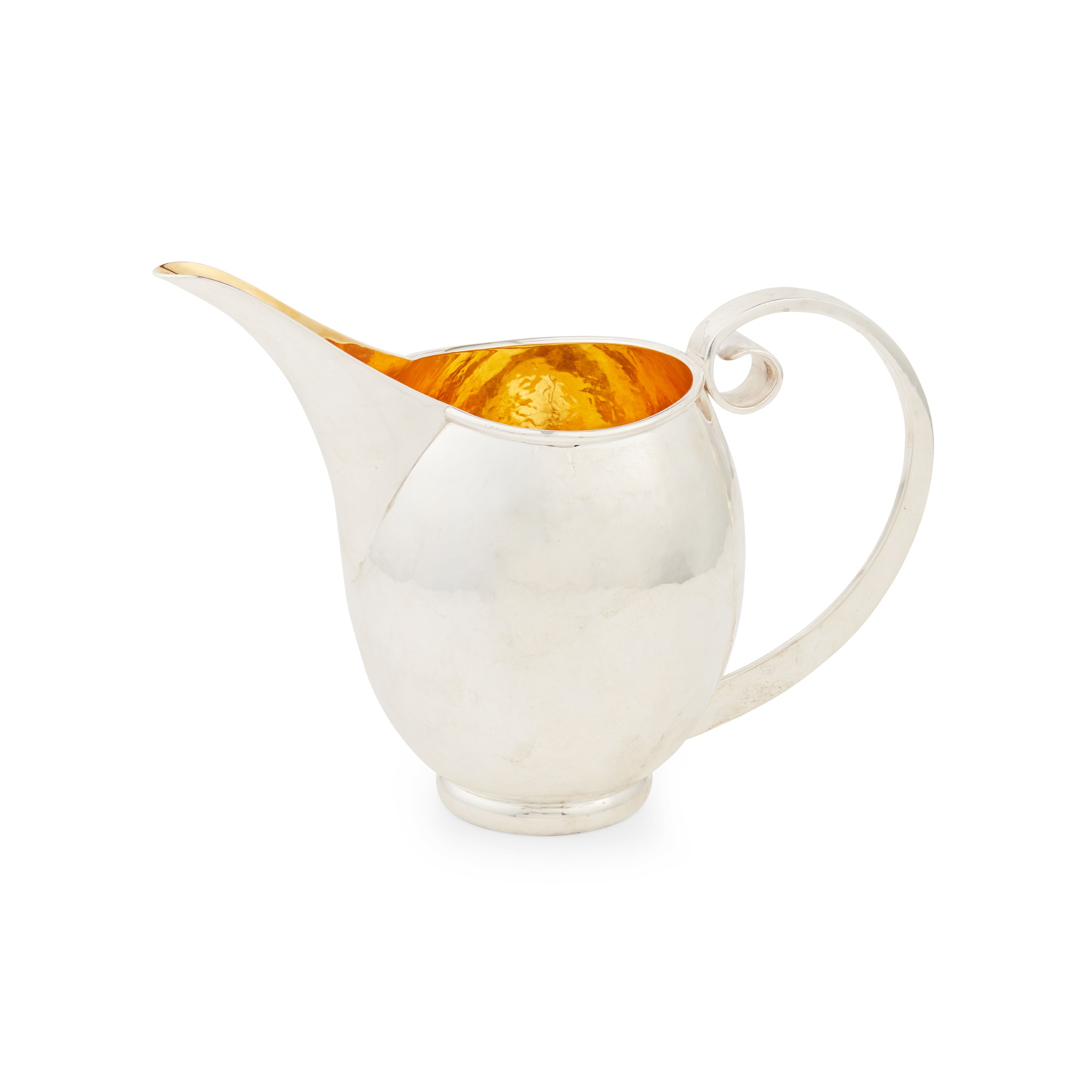 of hand raised and planished baluster form with long tapered spout the handle of curved form with scrolling terminal