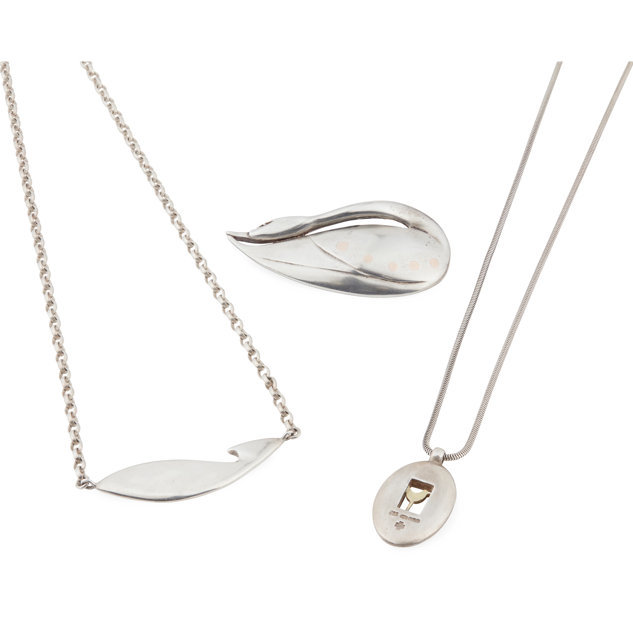 modelled as a stylised swan; together with an oval silver pendant with a pierced detail of a bird to centre, and another silver pendant