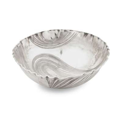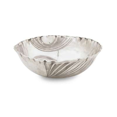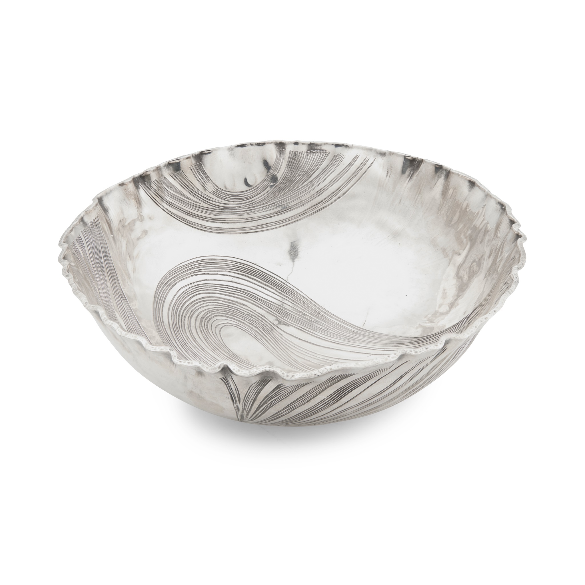 the slightly everted rim of undulating form, sweeping engraved detail throughout