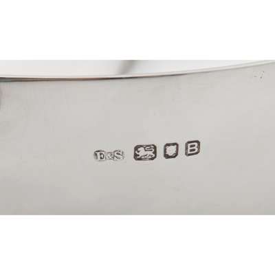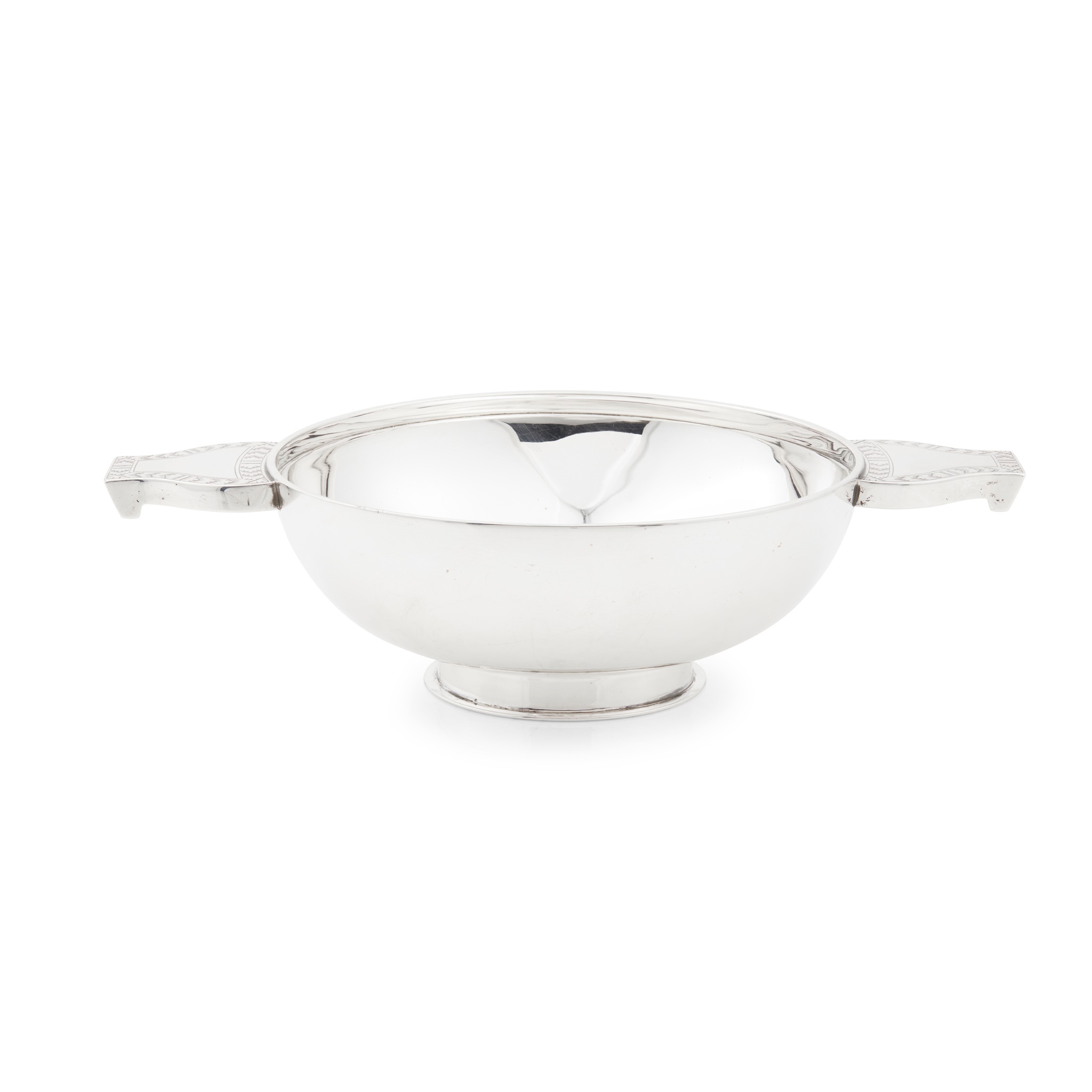 the large hemispherical bowl with twin-shaped lugs each with foliate engraved border, raised on a simple out turned collet foot