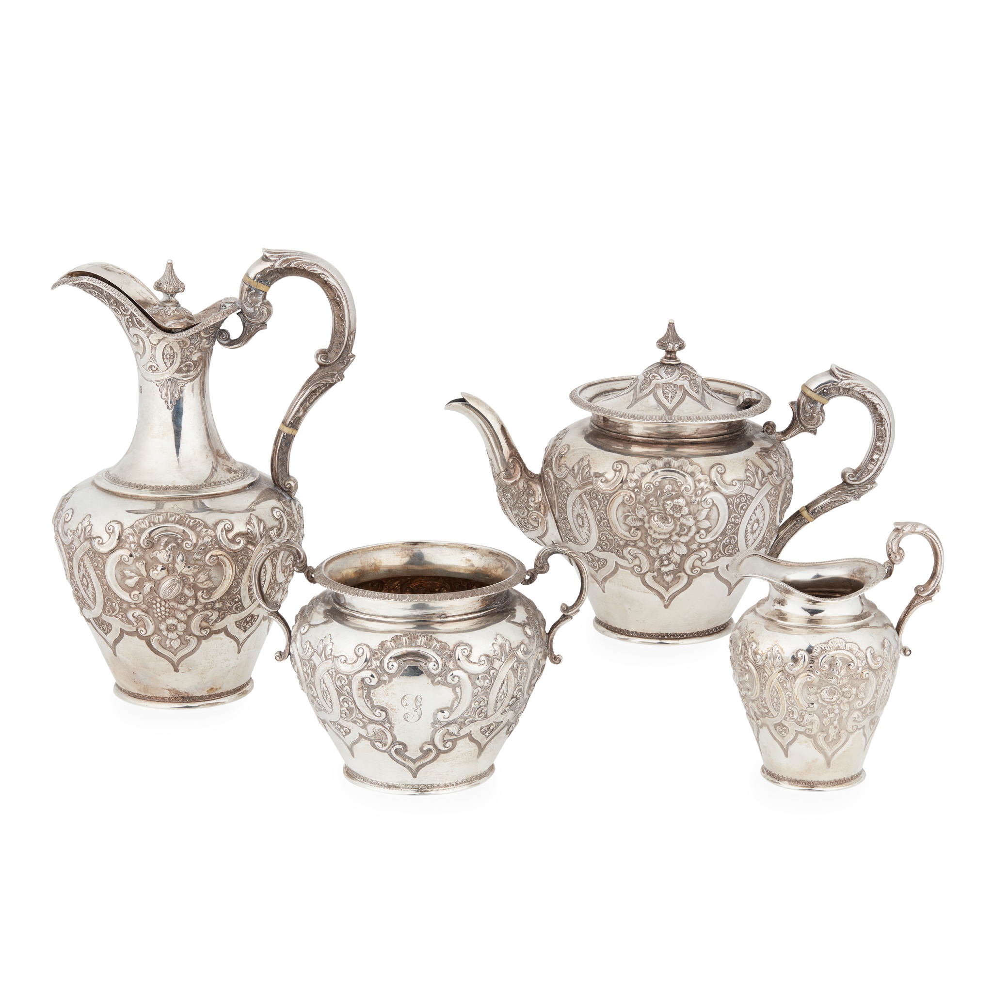 comprising a teapot, waterpot, sugar basin and a milk jug, each of inverted pear form, all-over chased floral and shell decoration, engraved initials to central cartouche, ivory inserts to S-scroll handles, the domed hinged lids with stylised finials