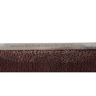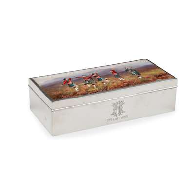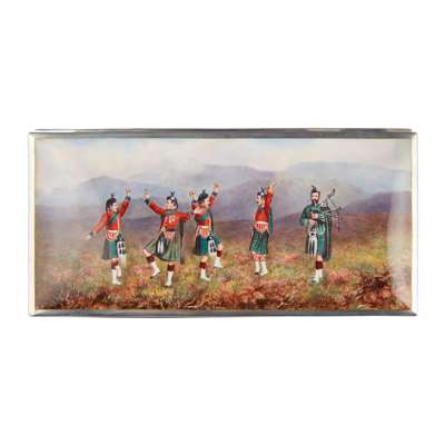 of rectangular outline, the hinged lid set with an enamel depiction of Highland soldiers in dance with a piper, engraved monogram and 11TH DEC 1893 to the front