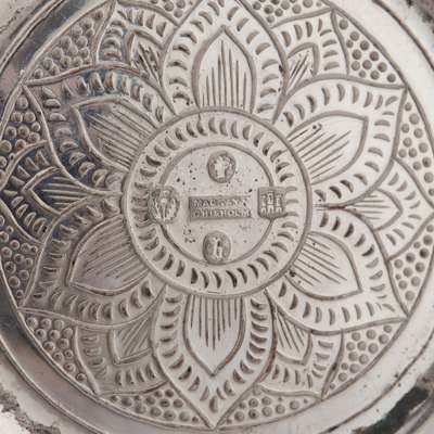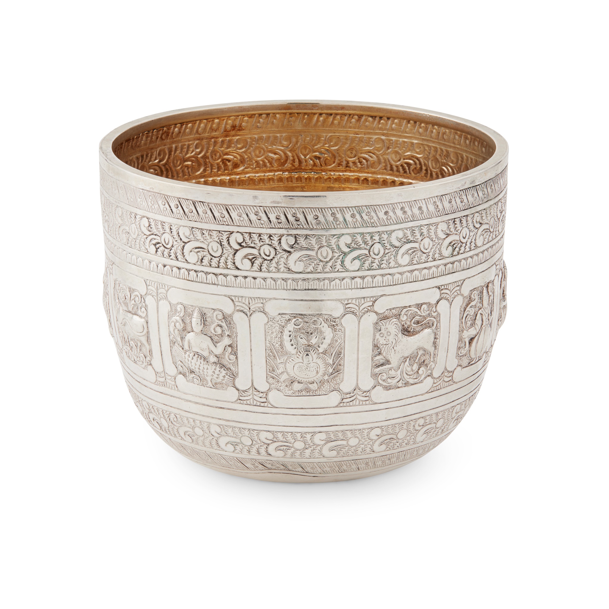 of deep hemispherical form, with a chased border of astrological signs, chased scroll decoration throughout, to a gilt interior