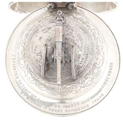 of cylindrical form, with allover engraved scroll cartouches for various winners, the central cartouche with presentation inscription, '...MID LOTHIAN COAST ARTILLERY VOLUNTEERS/ JULY 1862', the domed hinged lid with the finial modelled as artillery gun on carriage, the S-scroll handle with similar scroll decoration with ivory insert