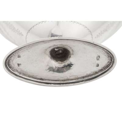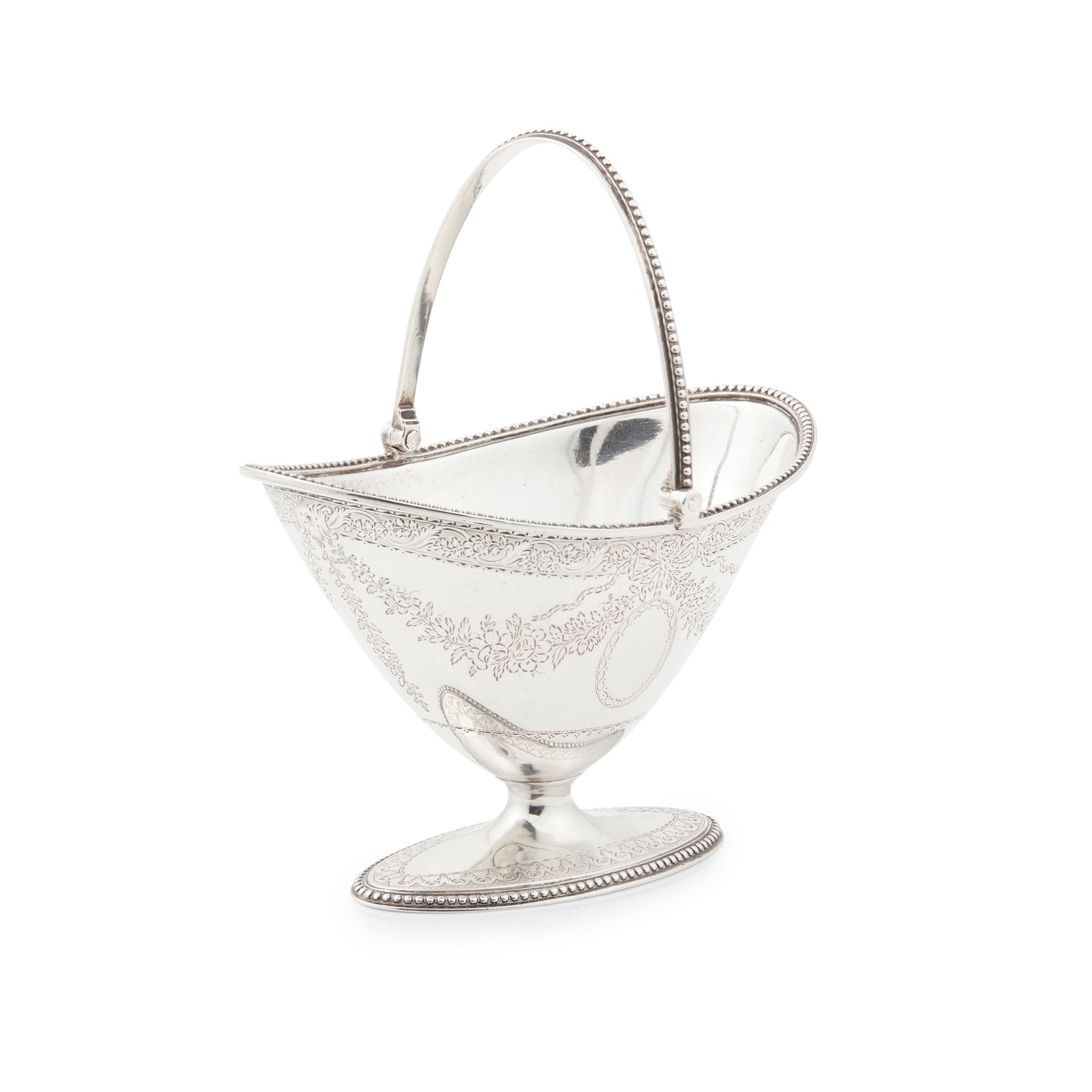 the tapered oval bowl with engraved ribbon and rose swags with an oval vacant cartouche, the beaded rim with a beaded hinged handle, raised on an oval base with acanthus engraved border and beaded rim