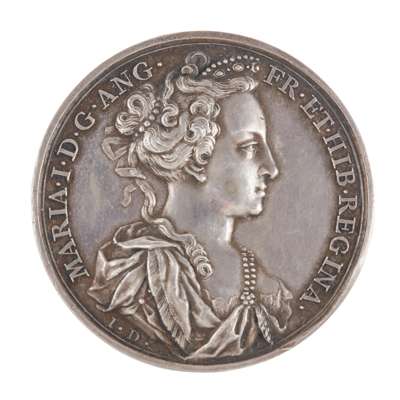 obverse three-quarter bust of Queen Mary facing right with the motto MARIA. I. D.G. ANG. FR. ET. HIB. REGINA, reverse with the figure of Religion seated before a monument to the right, a column, mounted with a medallion of the Pope, motto NATA. 18. FEBR. 1516. COR. 1 OCTOB. 1553. MORT 17. NOV. 1558