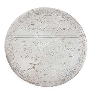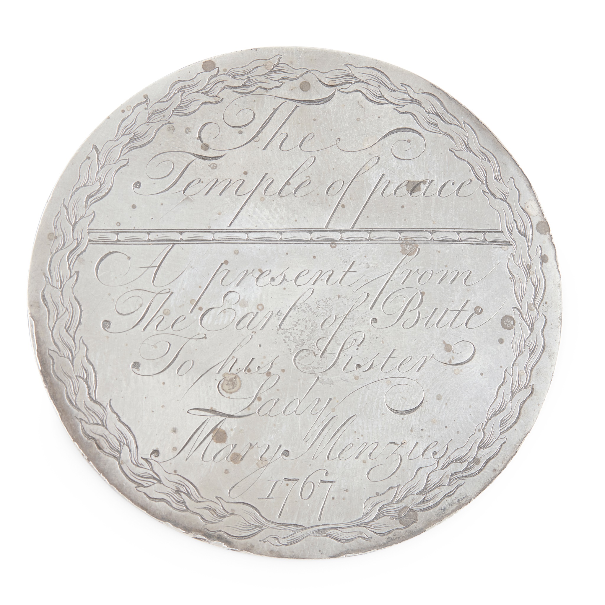 unmarked, the circular disc with engraved stylised leaf border, engraved in script ‘The Temple of Peace – A present from The Earl of Bute to his sister Lady Mary Menzies 1767’, the rear plain