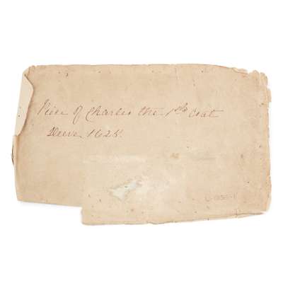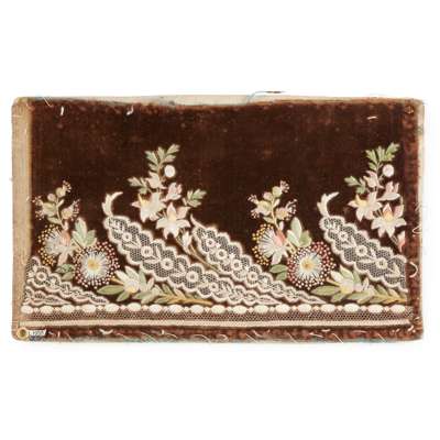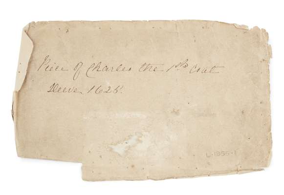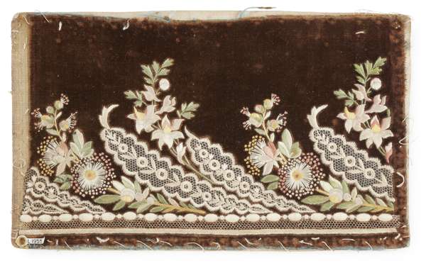of rectangular form, with National Museums of Antiquaries of Scotland label L.1955.1; previously believed to be part of the border from Charles I coat sleeve, the faded velvet with delicate embroidered floral and stylised leaf design, mounted on card; together with a handwritten note; "Piece of Charles the 1st coat sleeve 1625"