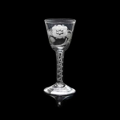 the deep round funnel bowl engraved with a displayed rose head flanked by open bud and foliage, the reverse of bowl with moth, raised combination enamel and air twist stem with spreading domed foot