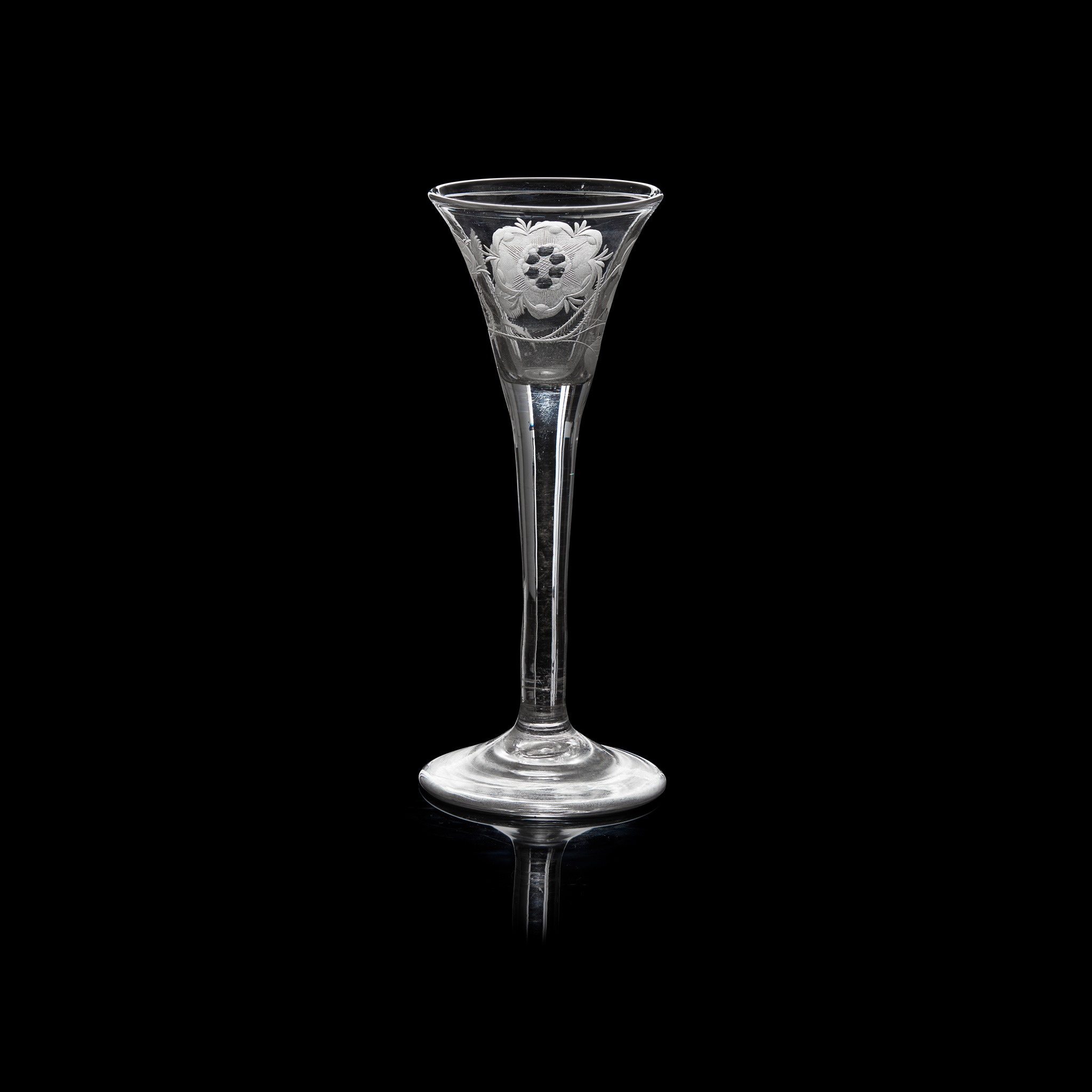 with drawn flared bowl engraved with displayed rose head flanked by open and closed buds and foliage, raised on a tapered cylindrical stem and domed circular foot, broken pontil to underside