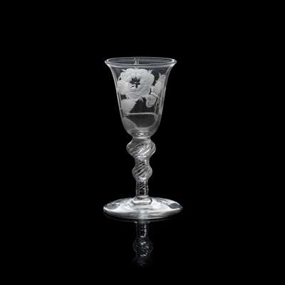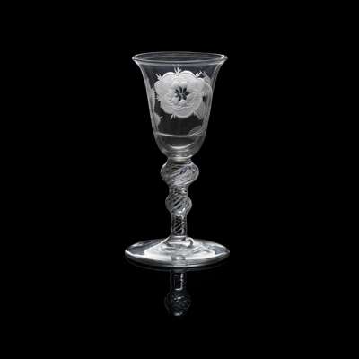 the deep bowl engraved with open rose head flanked by open and closed buds, the reverse with moth, raised on a short double knopped air twist stem, with spreading circular foot with slightly polished broken pontil to underside