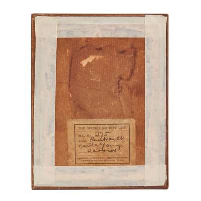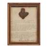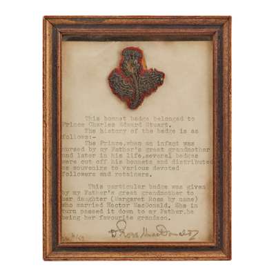 on red velvet ground with gold bullion and mirrored beads to form a displayed thistle, in an Edwardian frame with a typewritten presentation reading, ‘The bonnet badge belonged to Prince Charles Edward Stuart…’ and gives a family lineage for four generations