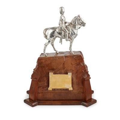 modelled as a Royal Scot's Grey trooper on horseback, modelled on the William Birnie Rhind sculpture, the silver-gilt plaque with presentation engraving 'Presented to Captain A.W.E. Crawford Royal Scot's Greys on the occasion of his marriage.. 1924' and names of contributors