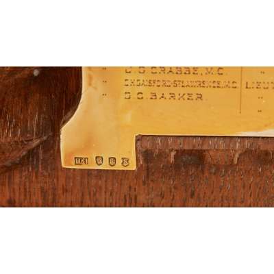 This sculpture was presented to Captain Crawford by the Royal Scots Greys on the occasion of his marriage to Helena Beatrice Dundas on the first of October 1924. Made by the renowned Edinburgh jewellers and silversmiths Hamilton & Inches, its cartouche details the members of the regiment at the time, then led by Lieutenant Colonel S J. Hardy. The sculpture reproduces the Monument by William Birnie Rhind, depicting Sergeant Major Anthony James Hinnigan from Jedburgh and his horse 'Polly', to the Royal Scot Greys found in Princess Street Gardens, Edinburgh. The monument was erected and unveiled by the Earl of Roseberry on the 16th November 1906, in commemoration of the fallen members of the Regiment during the Boer War. The equestrian statue, placed on a rock pedestal with inscription panels, represents a Royal Scots Grey trooper dressed in the uniform of the regiment when they were sent to South Africa in 1899.