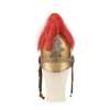 the brass helmet with applied copper badges, crown and named to the front with silver plated chin strap, red horse hair plume, the interior with black leather lining