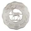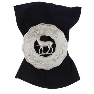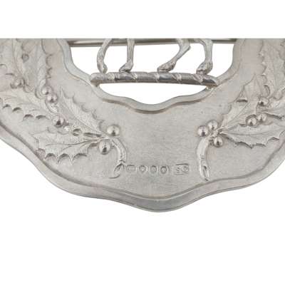 of shaped circular outline with cast border of holly leaves and berries on a textured back ground, the centre applied with a standing stag on a heraldic torse
